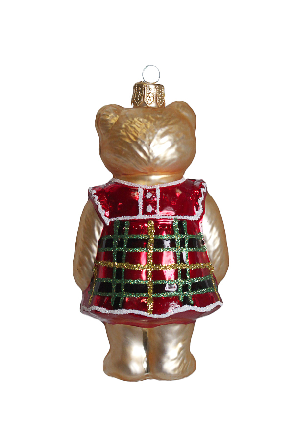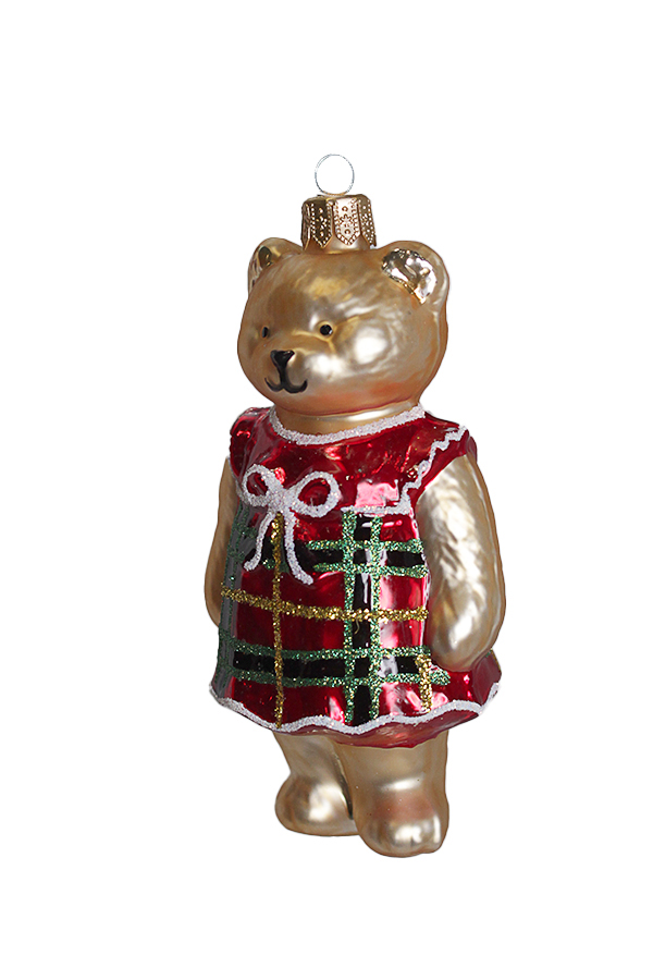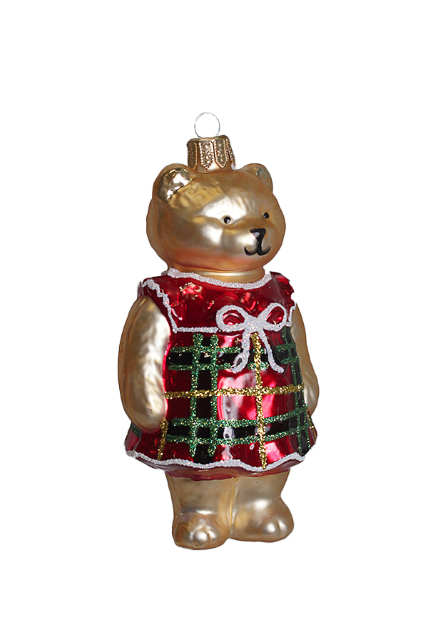 Новогодняя игрушка в виде медведя в красном платье с зелеными клетками и белым бантом.
