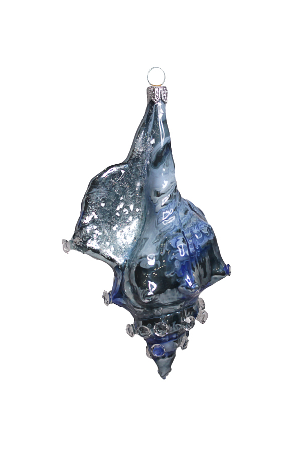 Ёлочная игрушка в виде синей ракушки с блестящими элементами.