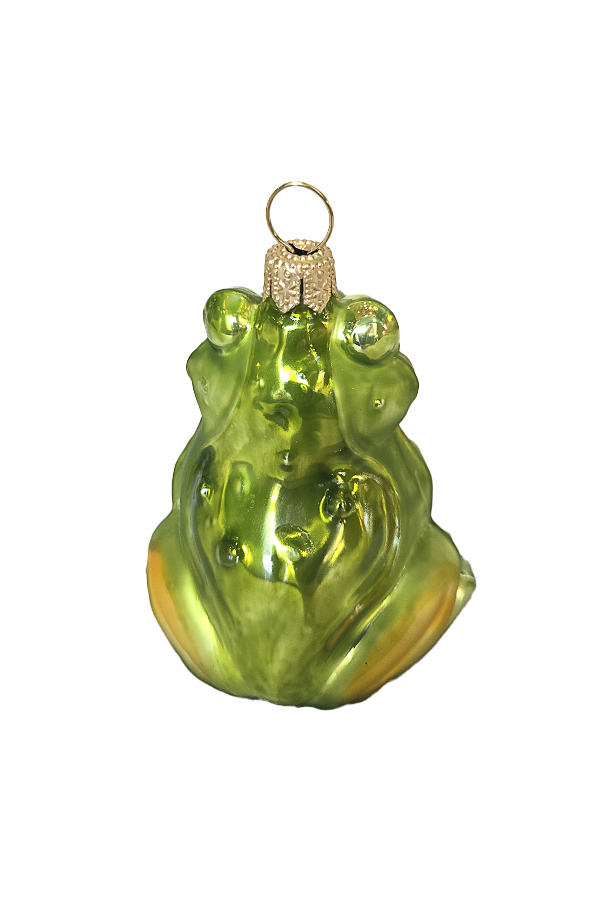 Ёлочная игрушка в форме зелёной лягушки с жёлтым животом и золотой петелькой для подвешивания.
